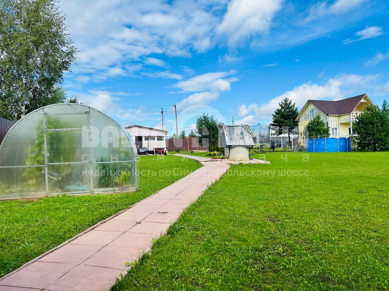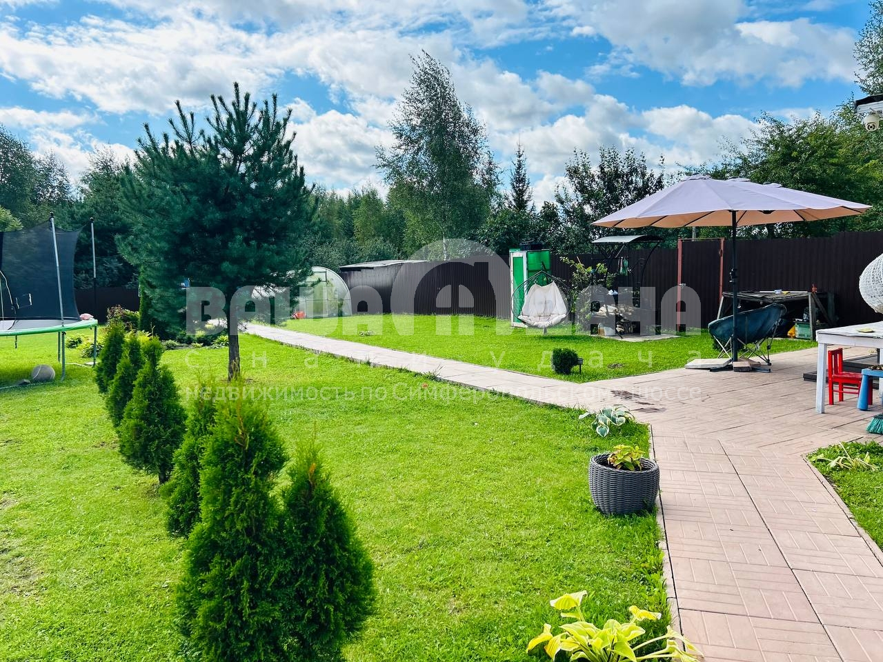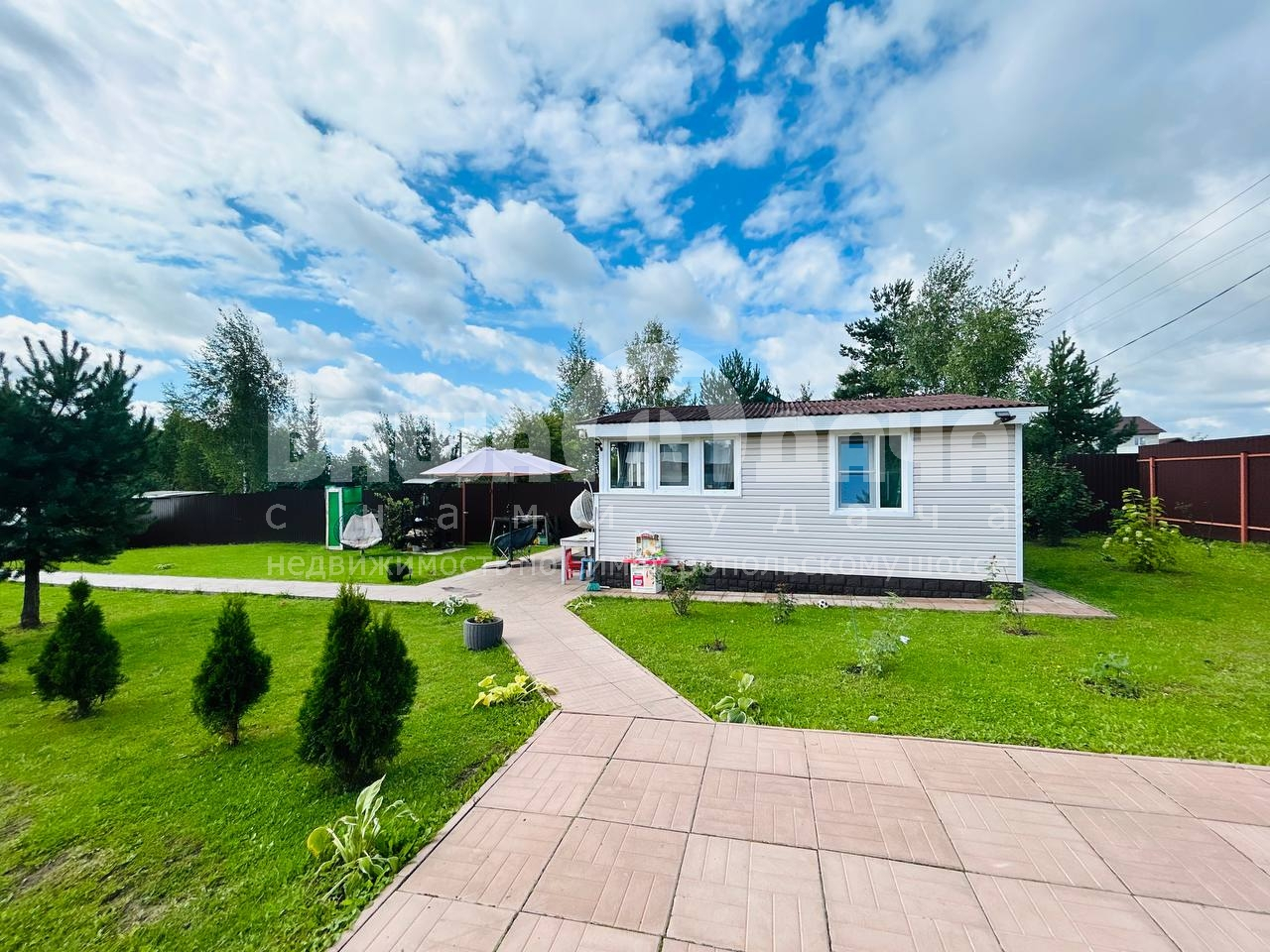 -Территория ухожена: дорожки и площадки выложены плиткой, аккуратный газон.